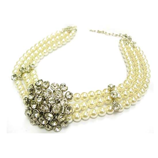 Pictured is a costume necklace with three strands of pearl-like beads to flaunt elegance. It is embellished with a silver charm that is structured with scattered silver findings. This costume necklace is a good complement to fashion ladies' dresses.