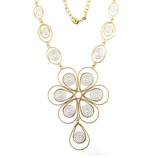 This fancy necklace features a unique flower design rendered in golden-toned wires. The necklace showcases meticulous craftsmanship with refined details. The 45cm long necklace is secured with a lobster claw closure.