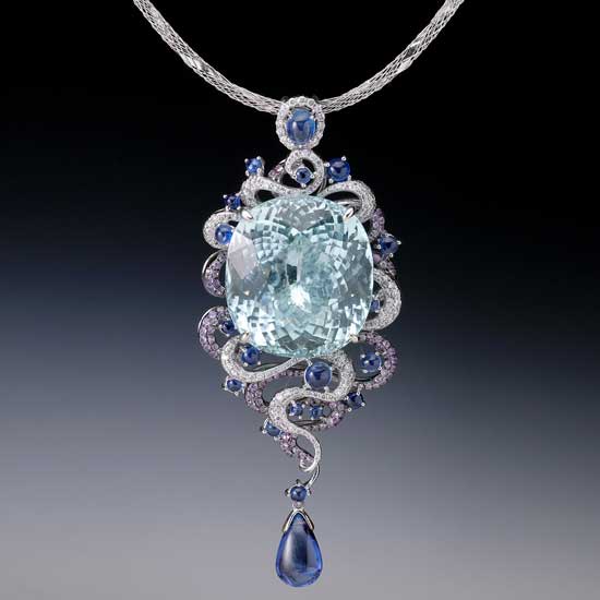 This stylish necklace spotlights a round icy blue stone surrounded by intricate filigree details. The tiny white and purple stones add more sparkle to this stylish jewelry. The gorgeous necklace makes a wonderful accessory for any formal occasion.