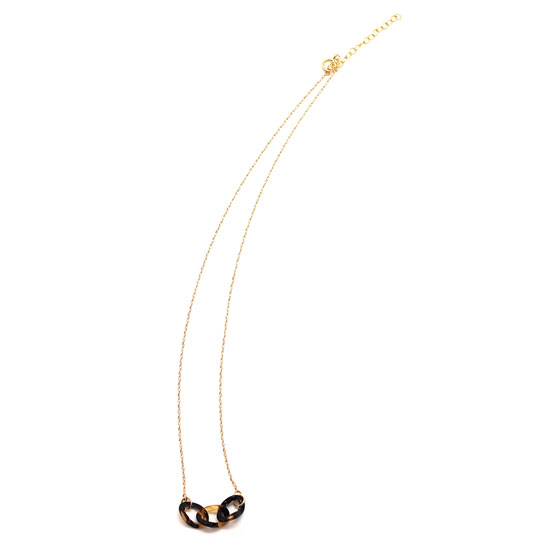 This is a fashionable costume necklace that is finely crafted with refined details. It is accented with three tortoise shell rings for a touch of style. This costume necklace shimmers with a high-gloss finish.