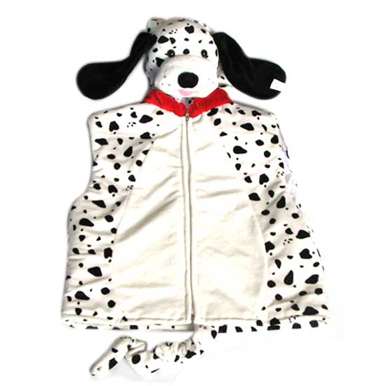 Here is a cute puppy costume for children to dress up for parties. The costume features a plush dog head on neck and a little tail. The white-and-black design looks eye-catching for various occasions.