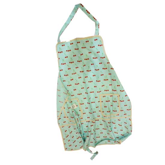 Protect your clothes from stains with this full apron when cooking. This light blue apron features a cherry pattern all over for a fresh look. The good-looking apron is configured with two pockets on the front for added functionality.