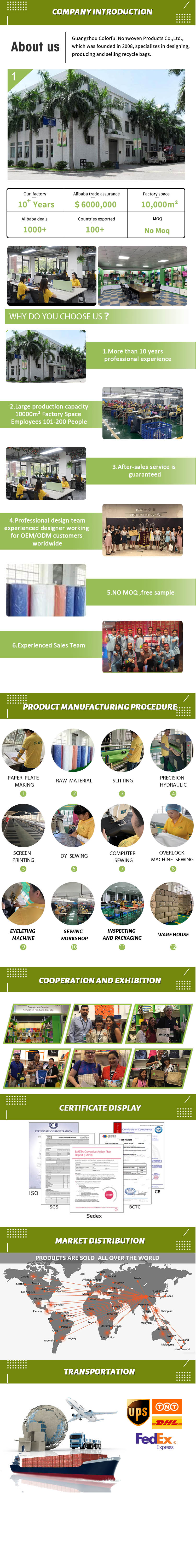 Our factory is located in Guangzhou China,With excellent geographical location and convenient transportation .The factory building covers and area of 10000M².The company strength is rich and has several advanced equipment such as :automatic single slitter,pouch,automatic slitter,cutter sewing machine,twin-needle M/C machine,High posted sewing machine,automatic computer sewing machine,hot cut flare machine, overlock machine,roasting picture machine etc.Also with 200 skillful workers who are working on cutting,Printing ,sewing and quality control workshop,We could make various recycle bags with silk screen printing off-set printing,heat transfer printing ,Machine rolling printing and sublimation printing ,Regarding the raw material,We use the best ones and have passed the SGS recycled report,our production capacity could reach two million PCS per mouth,And our products are salable at home and exported to the Occident,,Southeast Asia and so on.