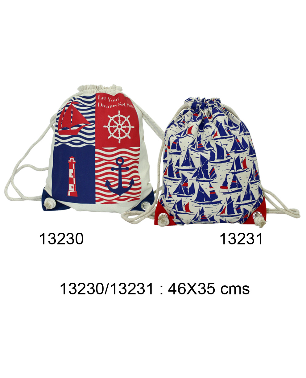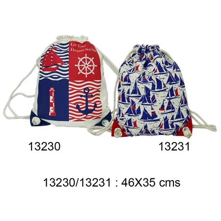 08 Ozs Natural Cotton and 10 ozs Dyed Cotton backpacks with cord straps.