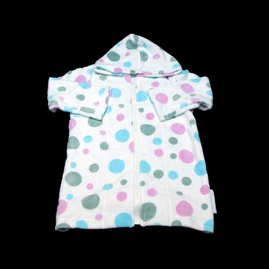 This is a ladies' bathrobe that is made of 100% cotton for maximum softness and comfort. It is beautifully adorned with colorful dot prints for a sense of attractiveness. The hoodie collar, long sleeves and zip-up closure complete this stylish bathrobe.