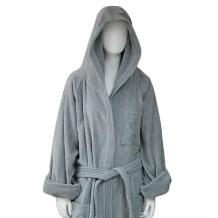 This is a cotton bathrobe that comes with a hood. Featuring a velour touch, this bathrobe is comfortable and soft. This high quality bathrobe is a great choice for families.