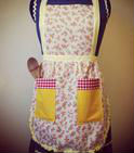 Demonstrated is a classy bib apron in bright colored appearance.