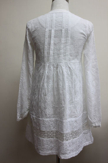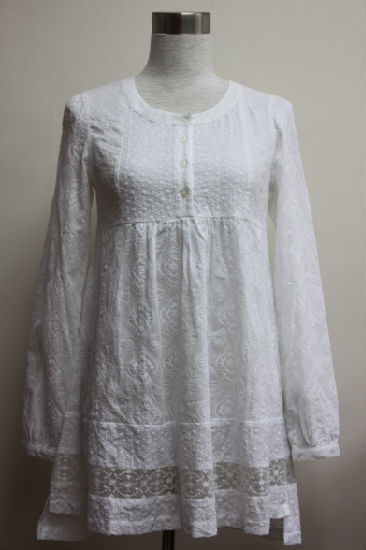 Elegantly designed, this white cotton blouse dress is the best choice for casual wearing or to be matched with a nice jacket. Long sleeved and loose fitted, this blouse with a round neck design and a flared hem will be great for autumn and spring. This enchanting shirt is finely completed with pleated detailing at bust and back and an embroidery lace above hemline, surely adding a touch of uniqueness to your wardrobe.
