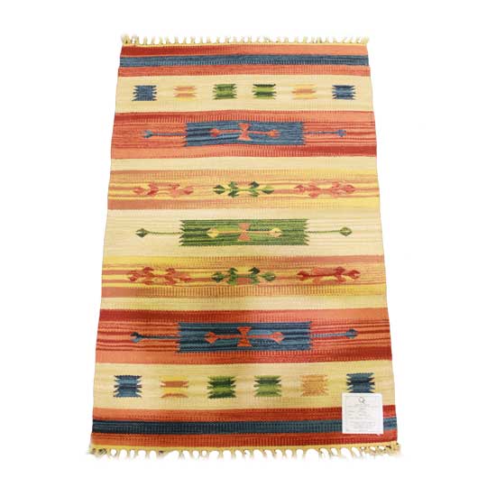 This rectangular-shaped carpet boasts a colorful design. The ultra soft carpet is made from 100% cotton. The tassel trimmings add flair and interest to the piece.