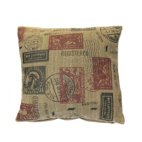 This vintage-style cushion is accented with unique stamp motifs. The square-shaped cushion is filled with cotton for a soft and comfortable touch. The trendy cushion is a tasteful decoration for your sofa, bed or chair.