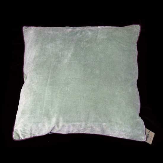 This square-shaped cotton cushion features a light green cover with a purple rim. The 100% cotton cushion is ultra soft and comfortable. The functional and stylish cushion can be used at home or in your office.