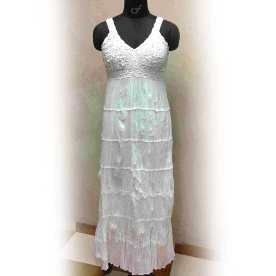 This long dress in white features a V neck and a sleeveless design. It comes with an embroidered panel for a feminine touch. This graceful long dress is fabricated from cotton.