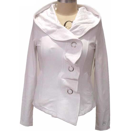 This white cropped cotton jacket features a sailor collar, with the row of buttons slightly inclining to the left. The jacket offers a flattering fit with a tight waistline, highlighting the femininity of the wearer.