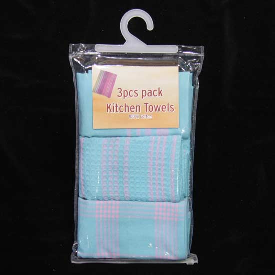 The set includes 3 pieces of kitchen towels in a clear packaging bag. Made of quality cotton, the towels are quick drying and super absorbent. Enhance your kitchen setting in with this kitchen towel set.