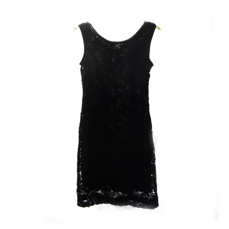 This simplistic black dress features a sleeveless design with a round, wide neckline. Made with lace material at the hem, this dress is sophisticated. Subtle and charming, this dress complements any figure perfectly.