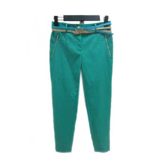 This is a pair of skinny pants in bluish green designed for young ladies. A pair of thin belts is included for defining the wearer’s waistline. The cotton and spandex construction allows gratifying wearing comfort.