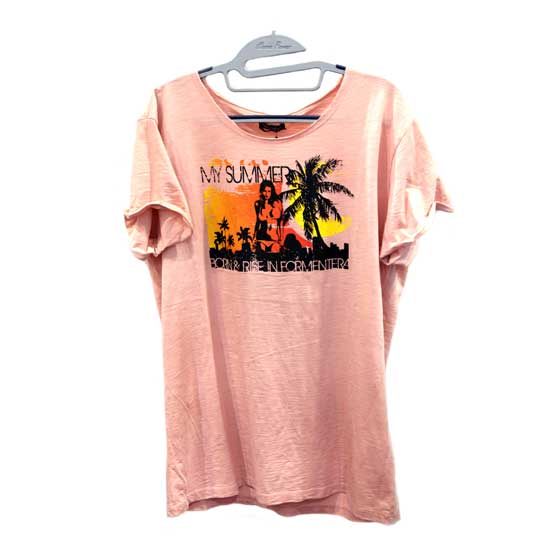 This is a short-sleeved T-shirt in slubbed cotton. The palm tree and hot woman motifs add a unique accent to the T-shirt. This displayed cotton T-shirt pairs well with tight jeans for a laid-back look.