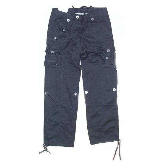 This is a pair of cotton twill cargo pants with many shiny buttons as decorations. It also has a thin strap at the bottom of each of the trouser leg for binding the bottom and work more conveniently.