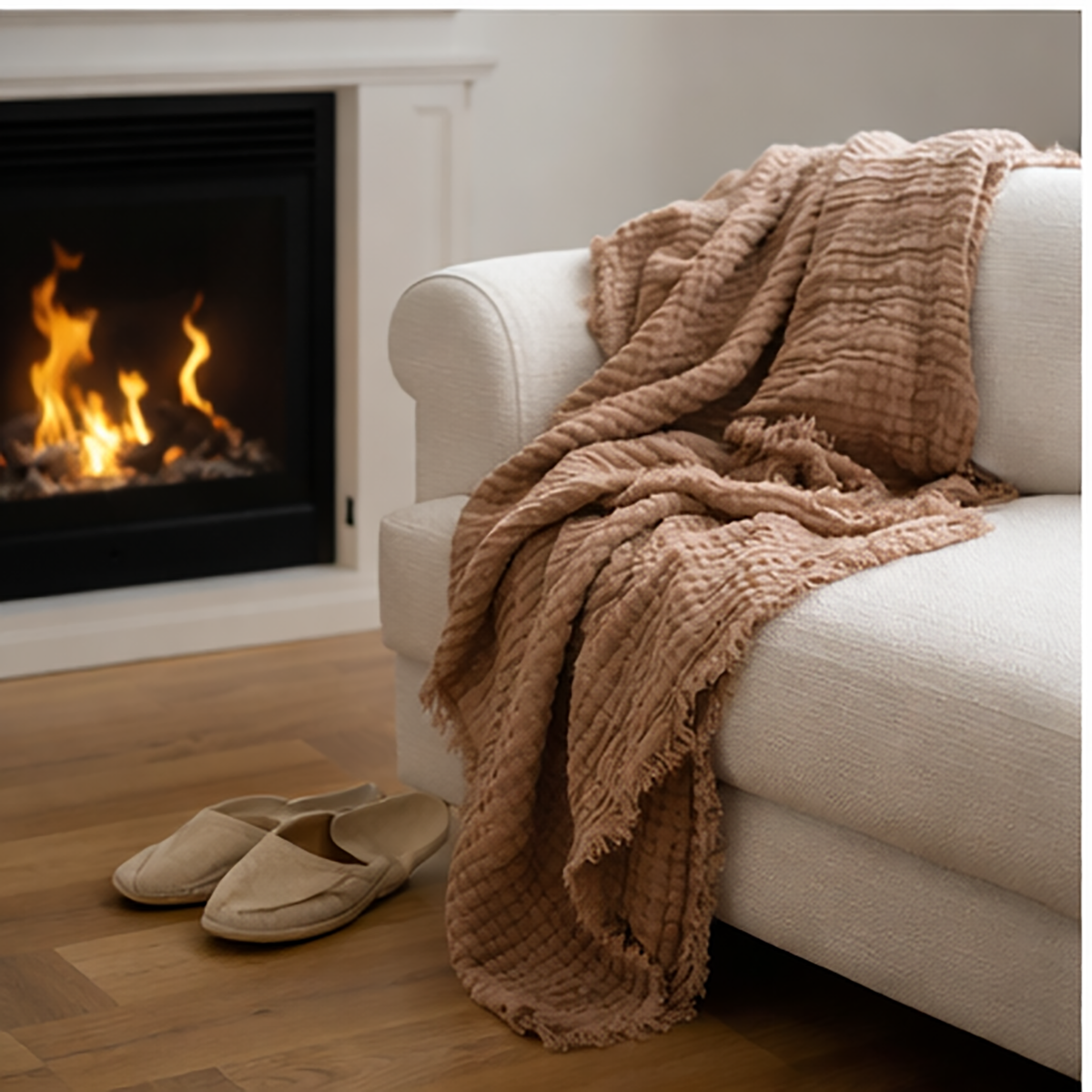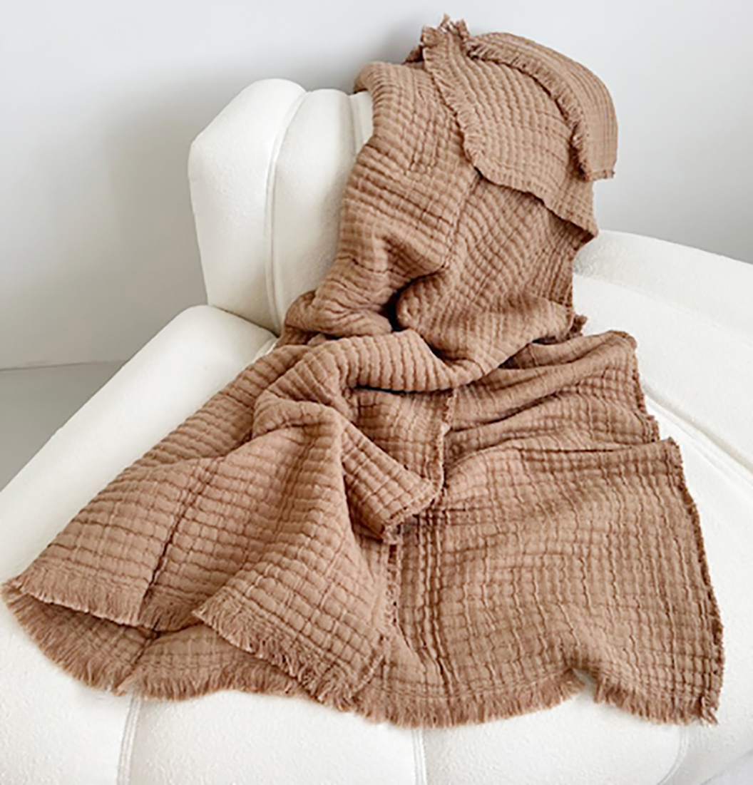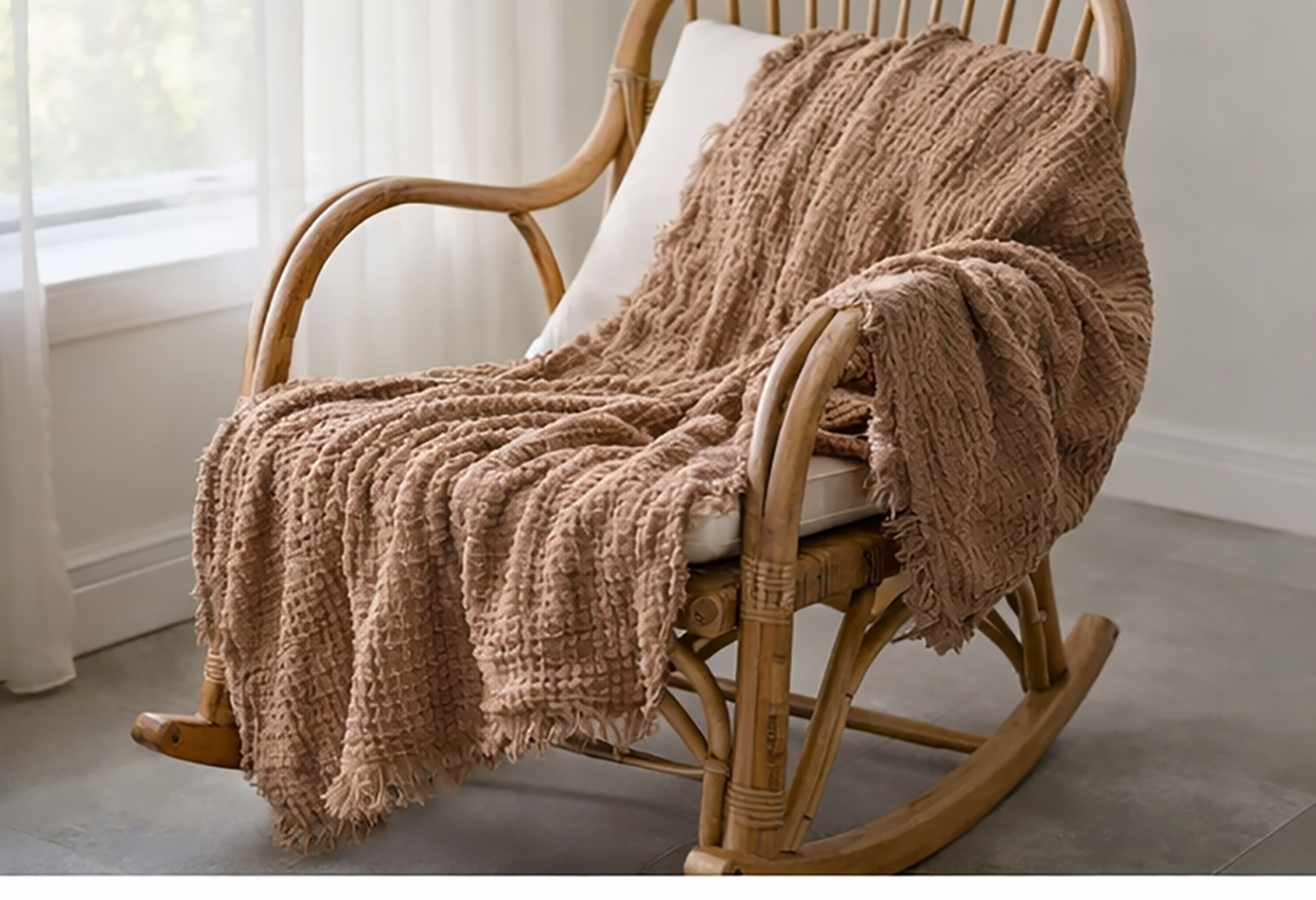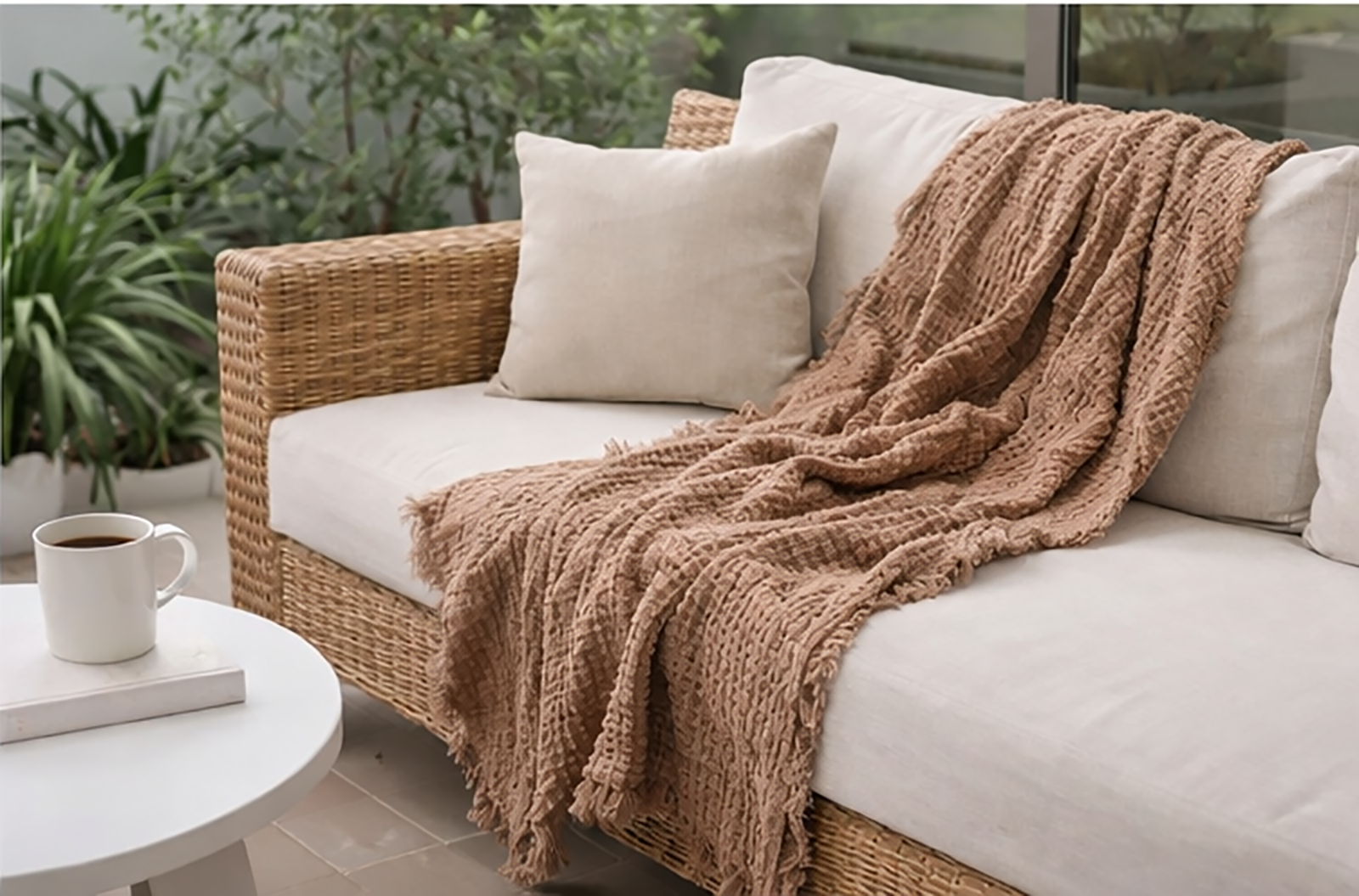 Designed for versatile functionality, it can be draped over a sofa, folded neatly at the foot of a bed, or used as a cozy wrap while reading or relaxing. Its refined finish and natural texture add warmth, elegance, and personality to any living environment.