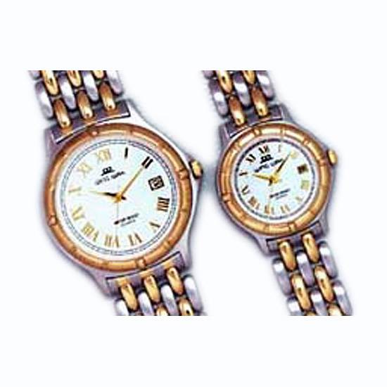 This is a couple analog watch set in a classic design. Each watch features a round stainless steel case and bracelets. The silvery and golden details give out a touch of luxurious glamour. This watch set surely is a great item for lovers.