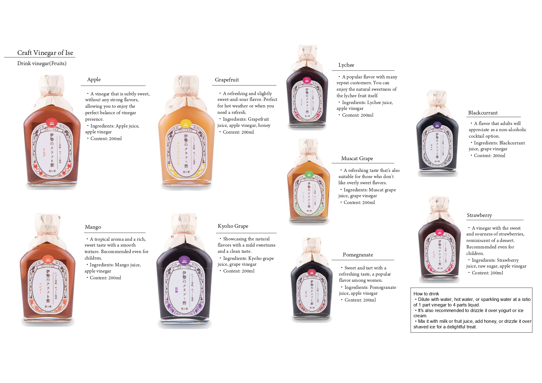 We've selected only the finest, simple ingredients for the fruit juice, and we've used the pristine waters of the Miyagawa River in Mie Prefecture, renowned as Japan's cleanest, for the water. Crafted by skilled artisans who can keenly detect flavor changes, we proudly present this dedicated drinking vinegar to you.