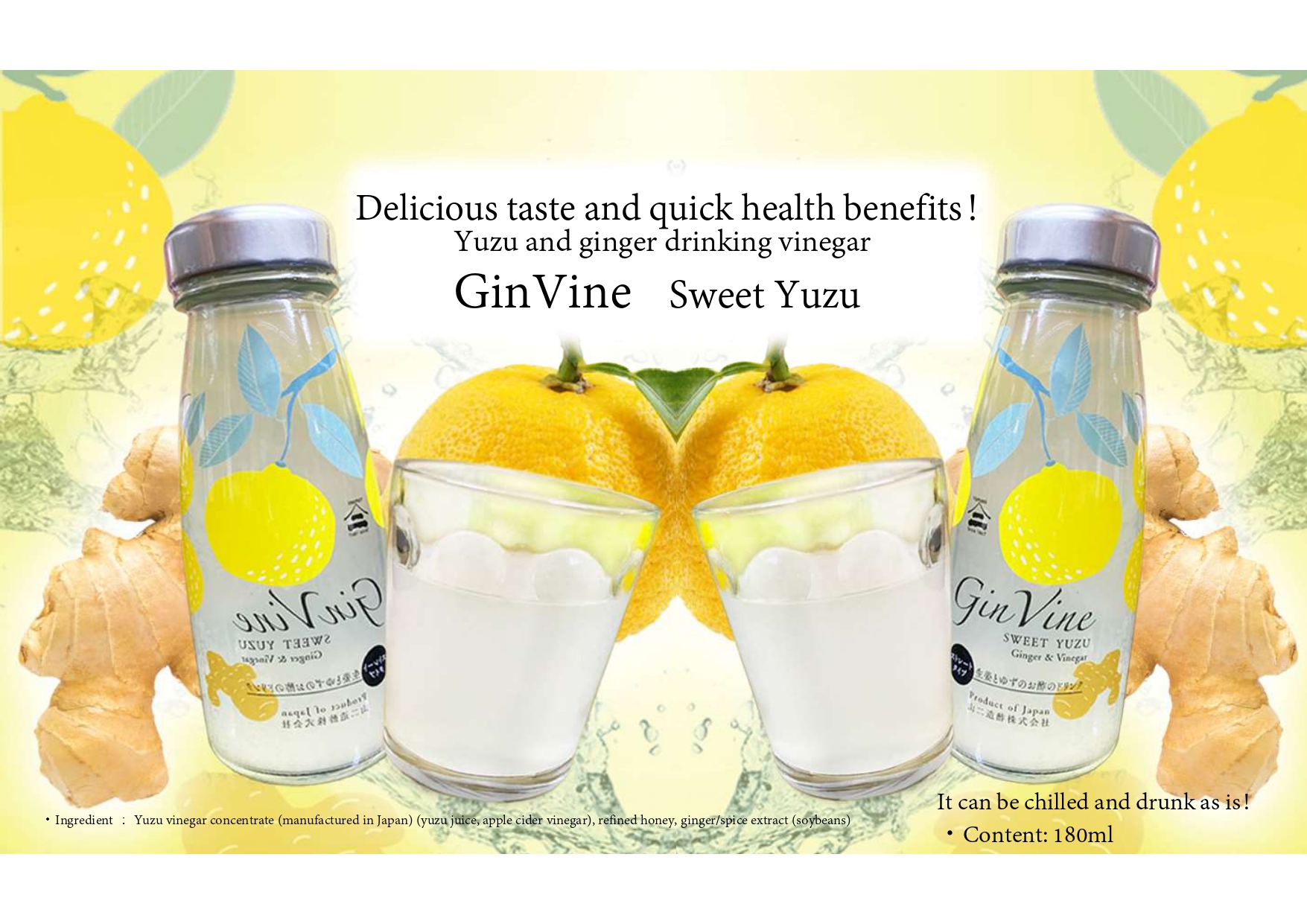 Ingredient : Yuzu vinegar concentrate (manufactured in Japan) (yuzu juice, apple cider vinegar), refined honey, ginger/spice extract (soybeans) It can be chilled and drunk as is!