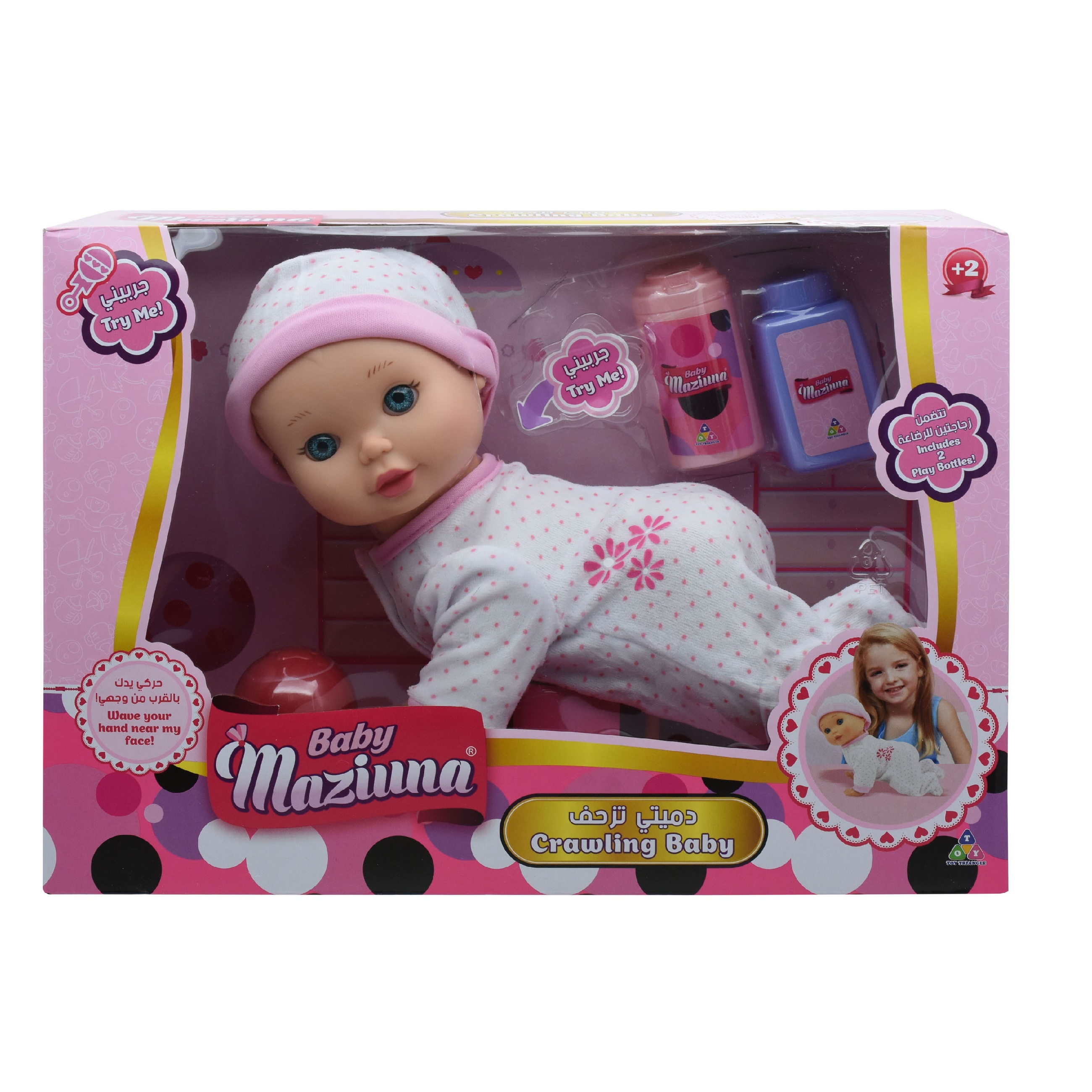 Baby Maziuna has started to crawl! Make sure to keep an eye on her as she actually crawls around! Little ones can also roleplay with the play baby powder, play baby wipes and ball.