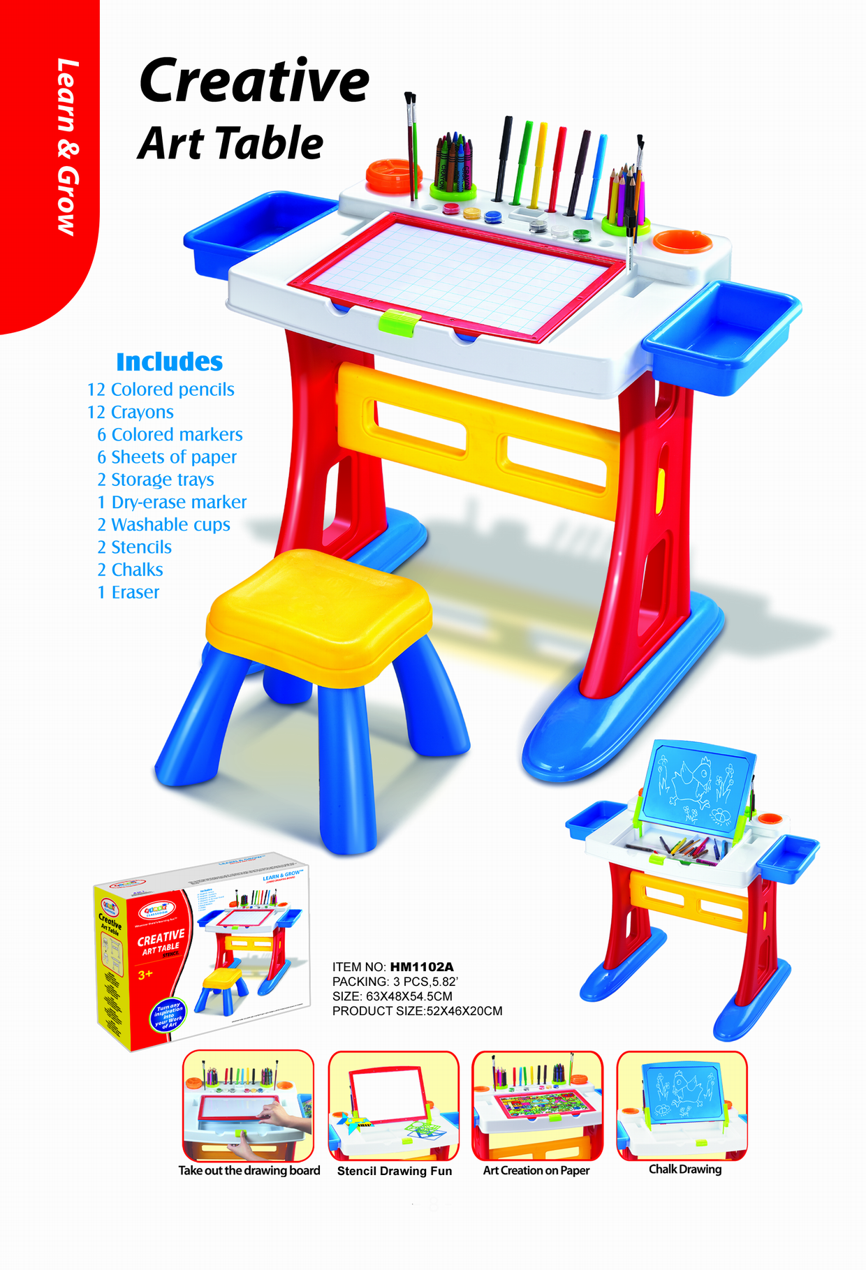 This kids’ art desk includes 12 colored pencils,12 crayons,6 colored markers,6 sheetsof paper,2 storage trays,1 dry-erase marker,2 washable cups,2 stencils,2 chalks,1 eraser, and large desktop workspace for little artists to create masterpieces