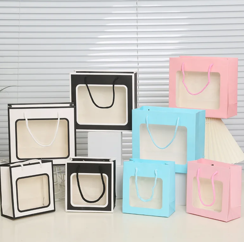 Creative Solid Color Kraft Paper Bag Window Luxury Screen Printing Logo Tote Clothing Shopping Birthday Gifts Food