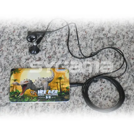 This is an audio guide with a thin and compact card body. It is designed with multiple languages for added utility. This gadget comes with a long-cable earphone in allover black.
