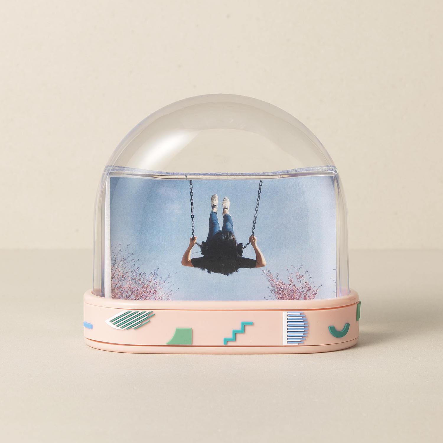 Photo water globe with customizable base design that is perfect for displaying your favorite photo. Rounded water globe that fits two rectangular photos, filled with water and shimmering glitter inside.