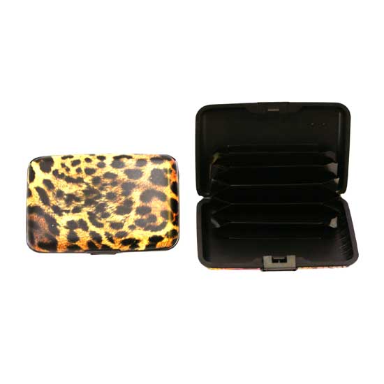 This is a credit card case designed in a rectangular shape with round corners. It is made of high-quality alloy for a durable structure. The leopard patterns on the exterior showcase a stylish and trendy touch.