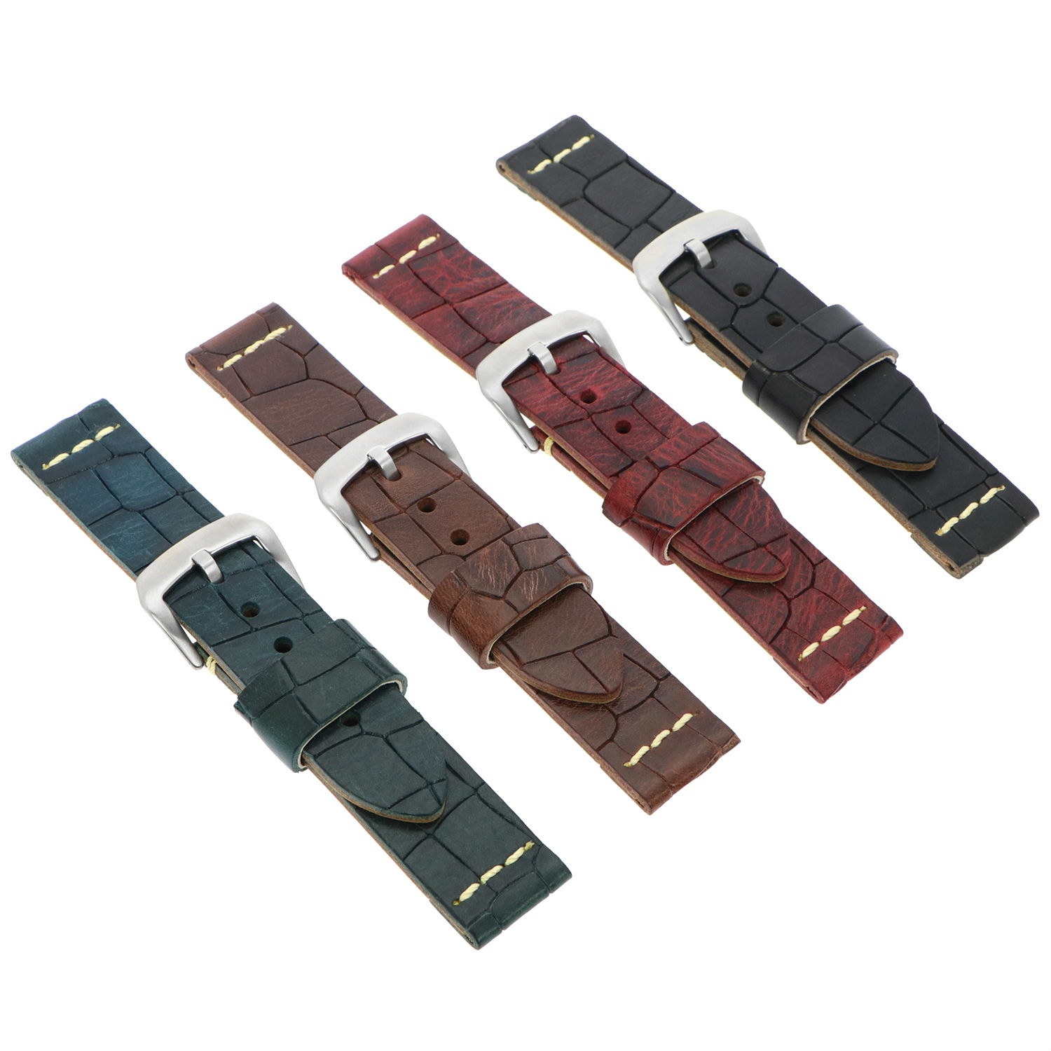 Fashionable and rugged, this watch strap is the finishing touch your new watch collection needs. This Italian cowhide strap presents a unique crocodile pattern for an exotic, elaborate, and vintage look. The antique look is then balanced out by the groundbreaking wide keeper and a robust and edgy vertical brushed buckle. With the perfect blend of modern and retro elements, this watch strap would uplift any watch designs.