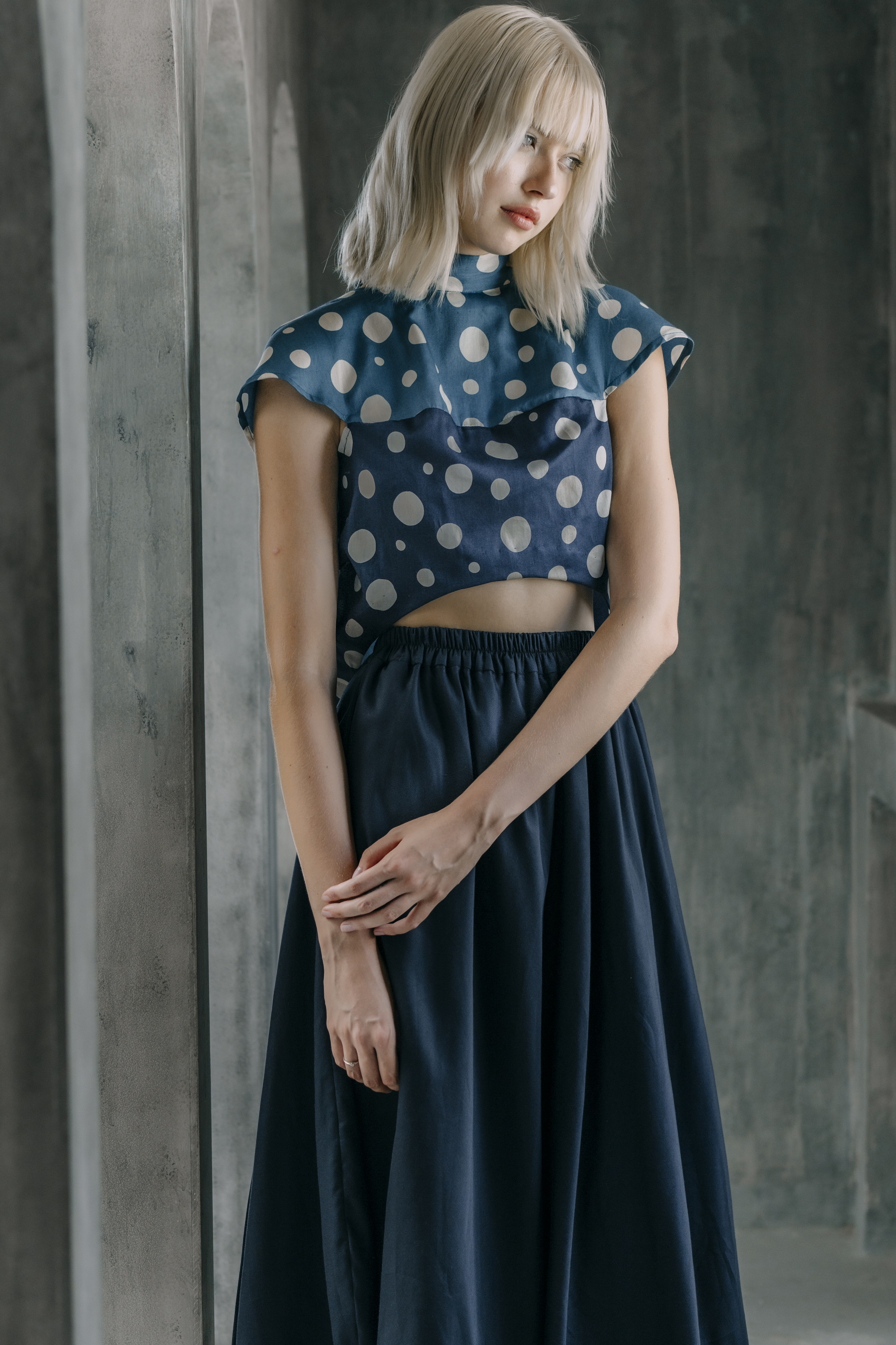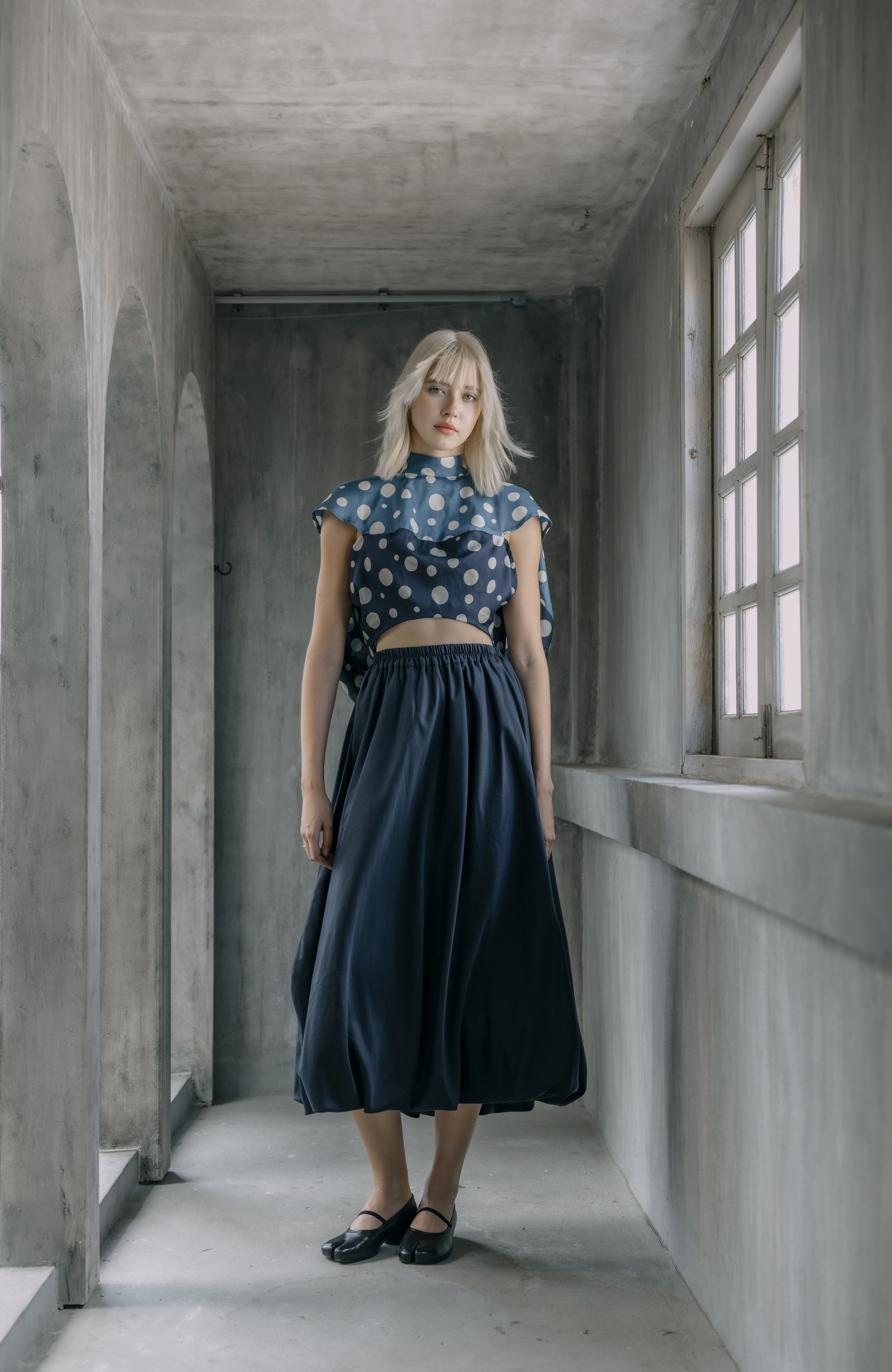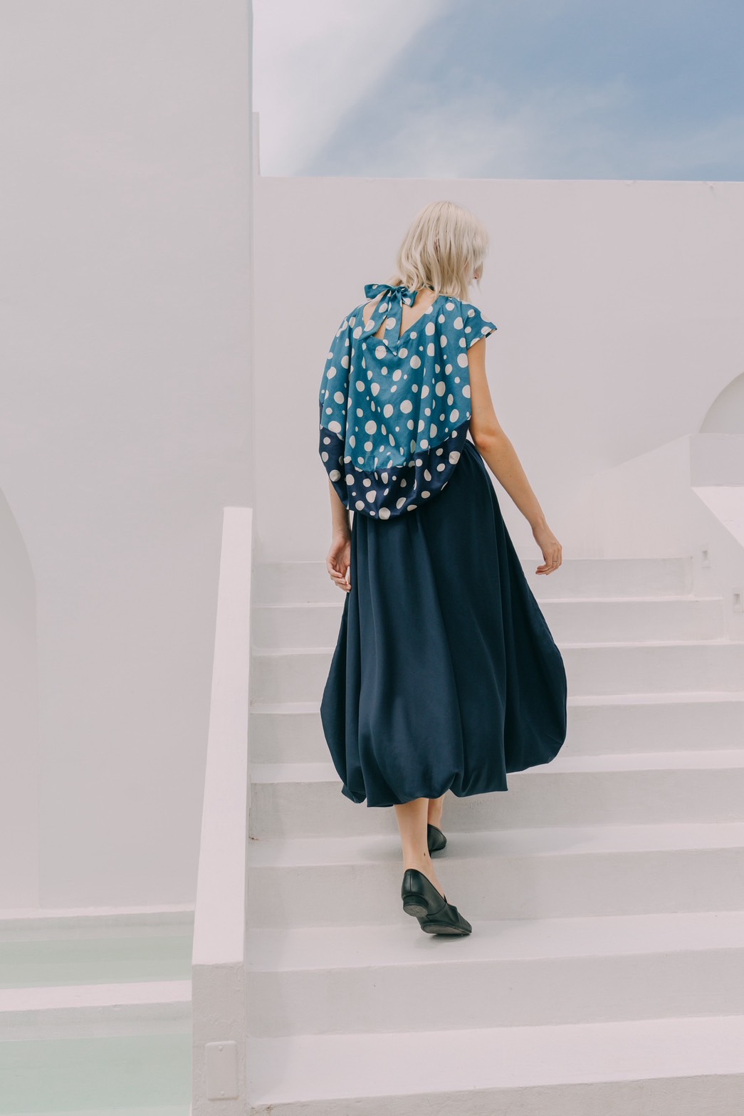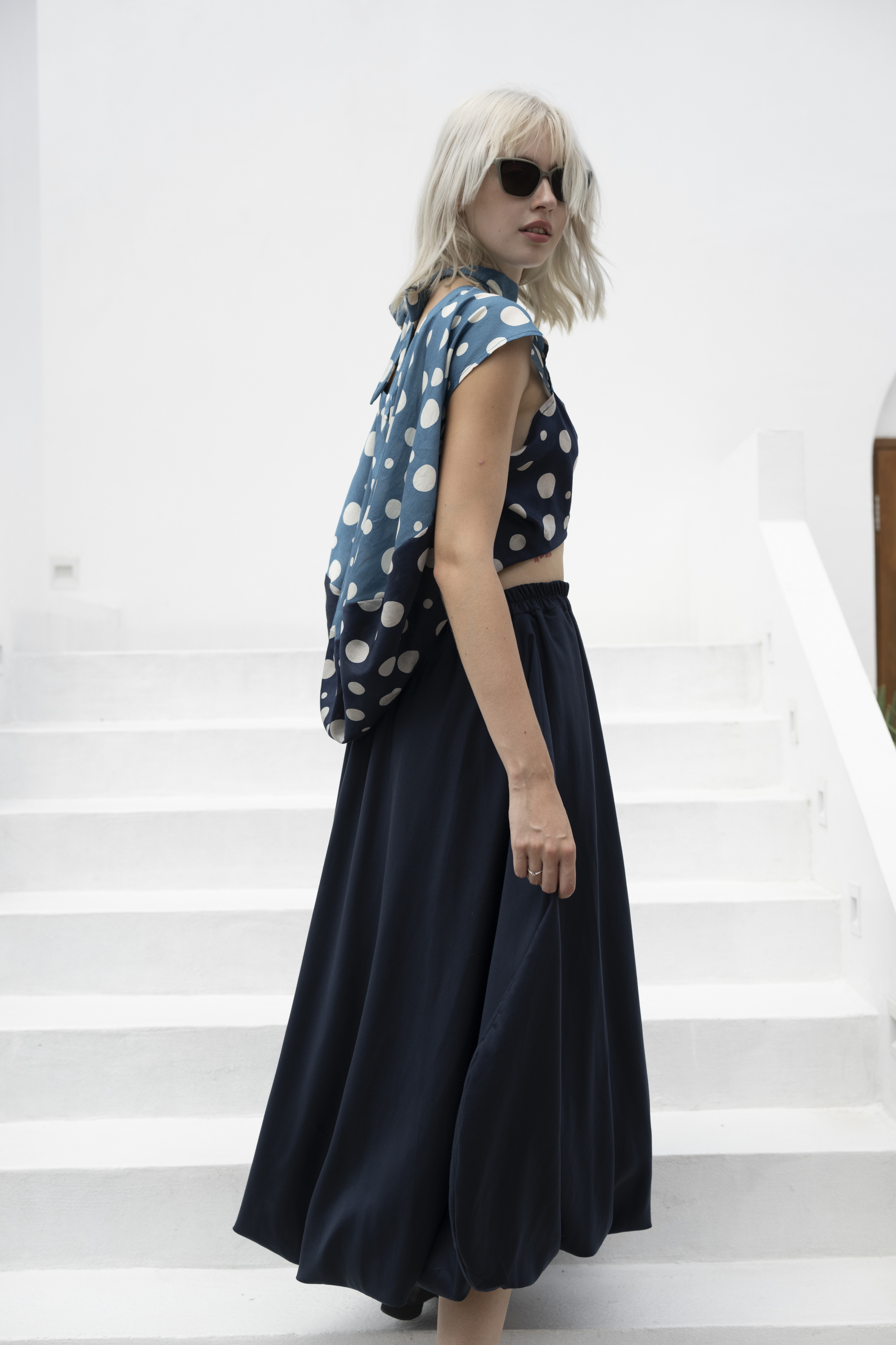 Front-to-back reversible cropped bubble blouse in blue cotton sateen print.100% cotton sateen print
