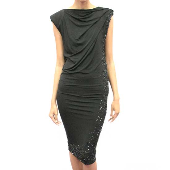 This black cocktail dress comes in a simple yet stylish design. The front of the dress is simply embellished with random shiny stones, yet its back features sexy cross-back design. The unique cutting makes this dress perfect for a cool party look.