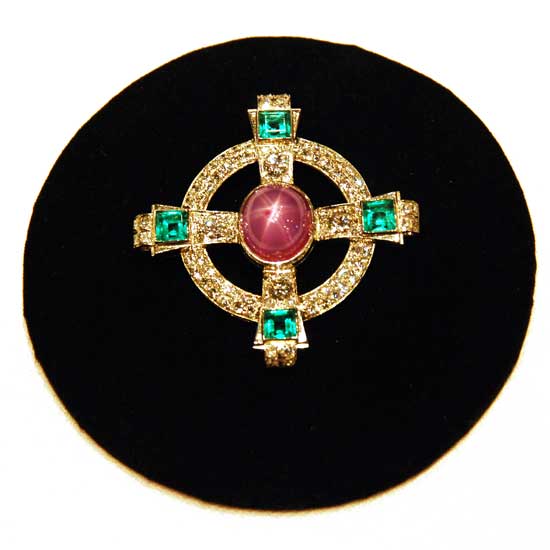 The platinum brooch is well embellished with a ruby, 4 well-polished emeralds and some brilliant-cut diamonds. It is an ideal accessory to complete your evening dresses. Add a classy touch to your elegant look with this dazzling cross brooch.