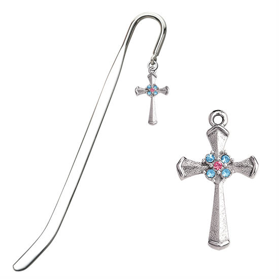 Dangling a cross pendent with sparkling pink and light sapphire stones, this metal bookmark marks the page in your favorite book for easy reading. Its polished nickel plating further unravels a delicate dose opulence to grab eyes.