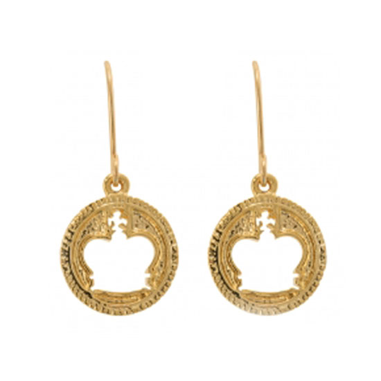 This pair of earrings shines brilliantly with the refined golden finish. The circular earrings are delicately carved with a crown shape at the center. Adopting a fishhook style, these earrings hang elegantly from the ears.