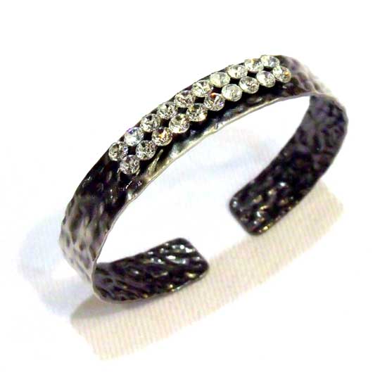 Displayed here is a cuff bangle made of brass with silver plating. It comes with crystal stones for added class and style. This crystal bangle is a great addition to your jewelry collection.