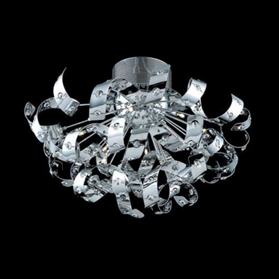 This is an elegant ceiling lamp that is made with curly steel or chrome sheets with a highly glossy finish. The shimmering crystal ornaments accent this ceiling lamp in a dazzling way. This ceiling lamp is an ideal decorative piece for brightening up your room.