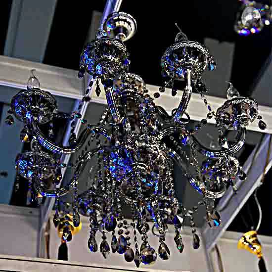 This is a beautifully designed crystal chandelier. It boasts 8 curled rods topped with candle holders for an elegant touch. This eye-catching lamp will undoubtedly beautify any rooms or hallways.