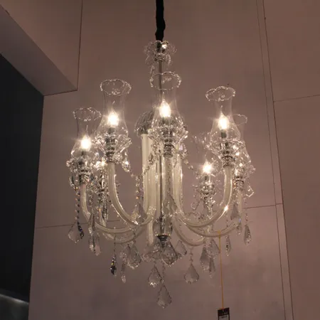 This pictured chandelier gives a stunning presence thanks to the faceted dangling crystals. The whole chandelier is crafted with transparent glass and crystal beads. The 8 dainty lampshades hold a candle bulb each for efficient lighting performance.