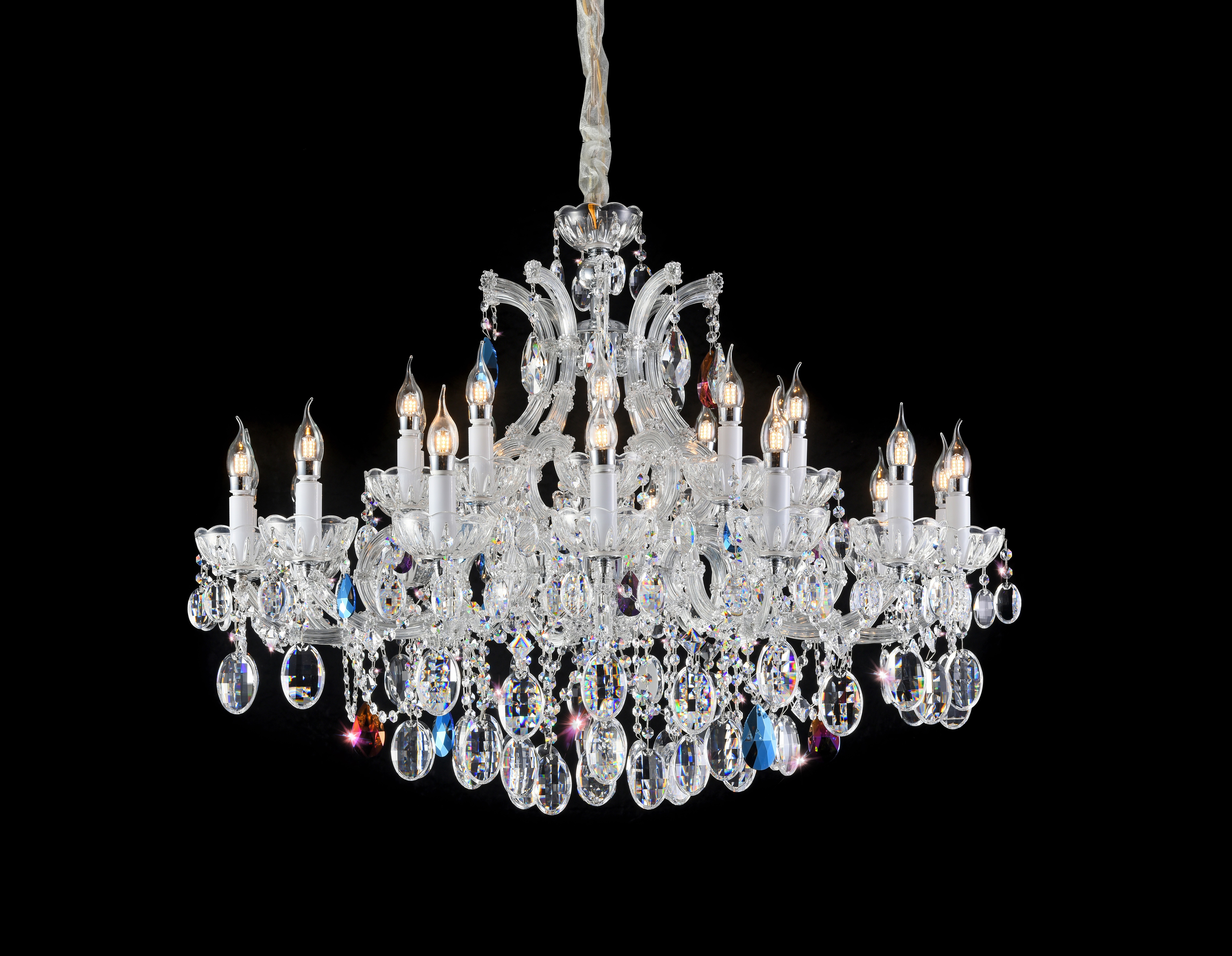 The crystal lamp hangs high in the air, twinkling like stars, casting a dazzling glow that is simply breathtaking.