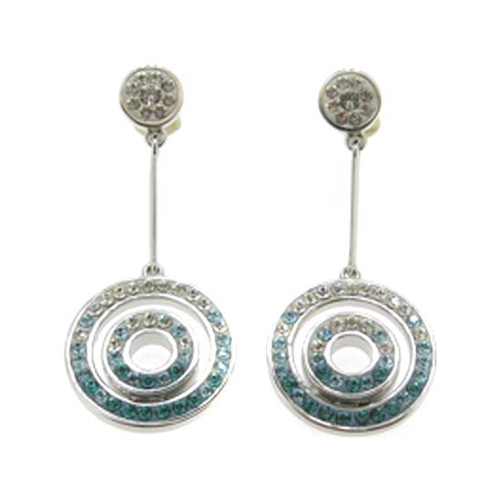 This is a pair of 925 silver crystal earrings. The drop earrings feature multiple small round Swarovski crystals set in the concentric silver plates, connected to a round silver plate with nine small transparent round crystals on. The earrings are attached to studs.