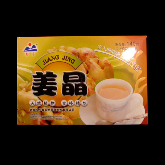 The main ingredients of this crystal ginger tea are ginger and brown sugar. The ginger can warm the menses and dispel cold, while brown sugar can replenish qi and blood, and can strengthen the spleen and stomach. The tea is one of the best remedies for a cold, sore throat and indigestion.