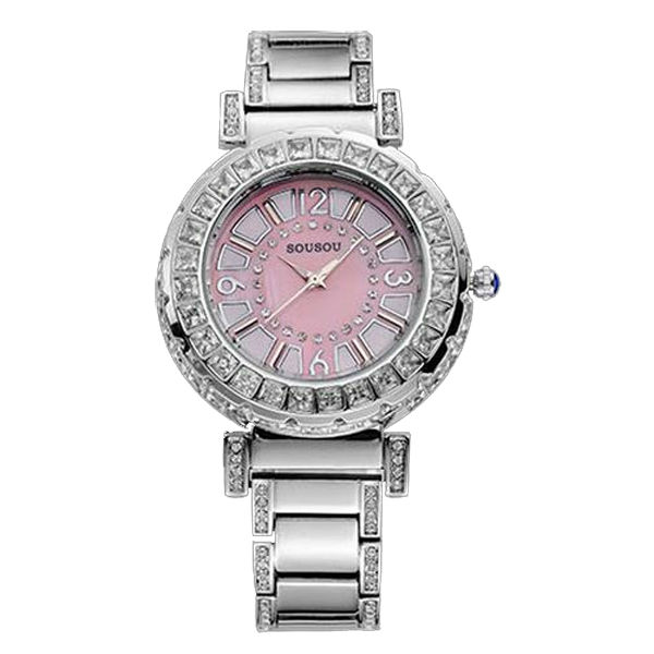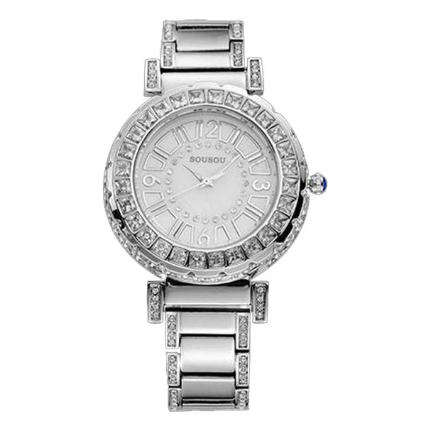 This eye-catching trendy quartz watch in sparkling tone is decorated with luxurious looking CZ crystals and high fashion designed bangle bracelet attaching to a jewelry clasp.