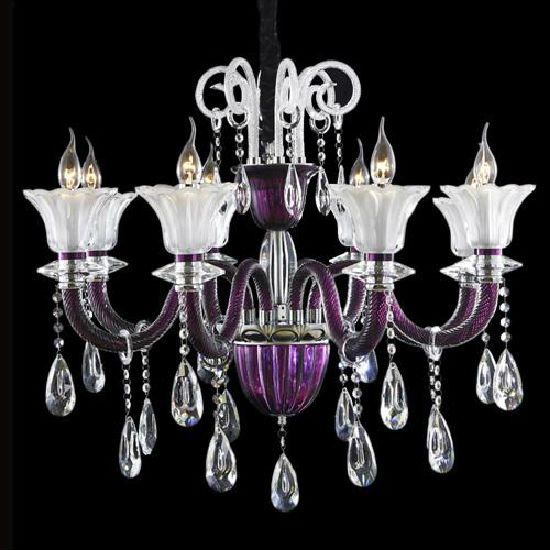 This is a well-designed crystal chandelier with luxurious and elegant feeling.Each glass arm is artfully filled in purple with dazzling waterdrop adornment.The item is much suitable for households,adding alluring color in the house.