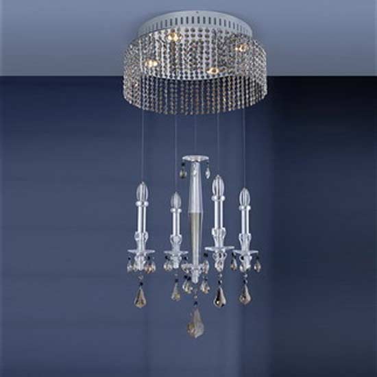 This beautiful ceiling lamp boats a modern contemporary design. The lamp features a plain frame design with candle-shaped bulbs. Adorned with contemporary-cut Swarovski strass crystals, the lamp gives out gorgeous sparkle.