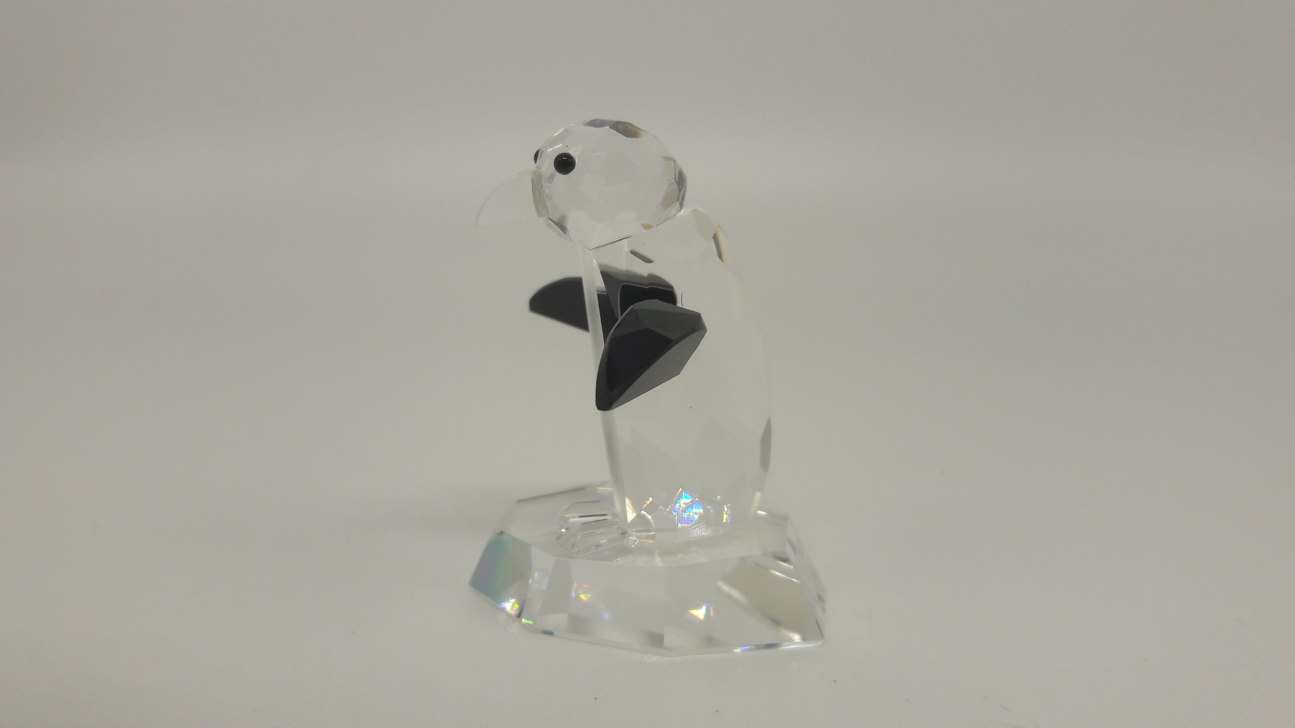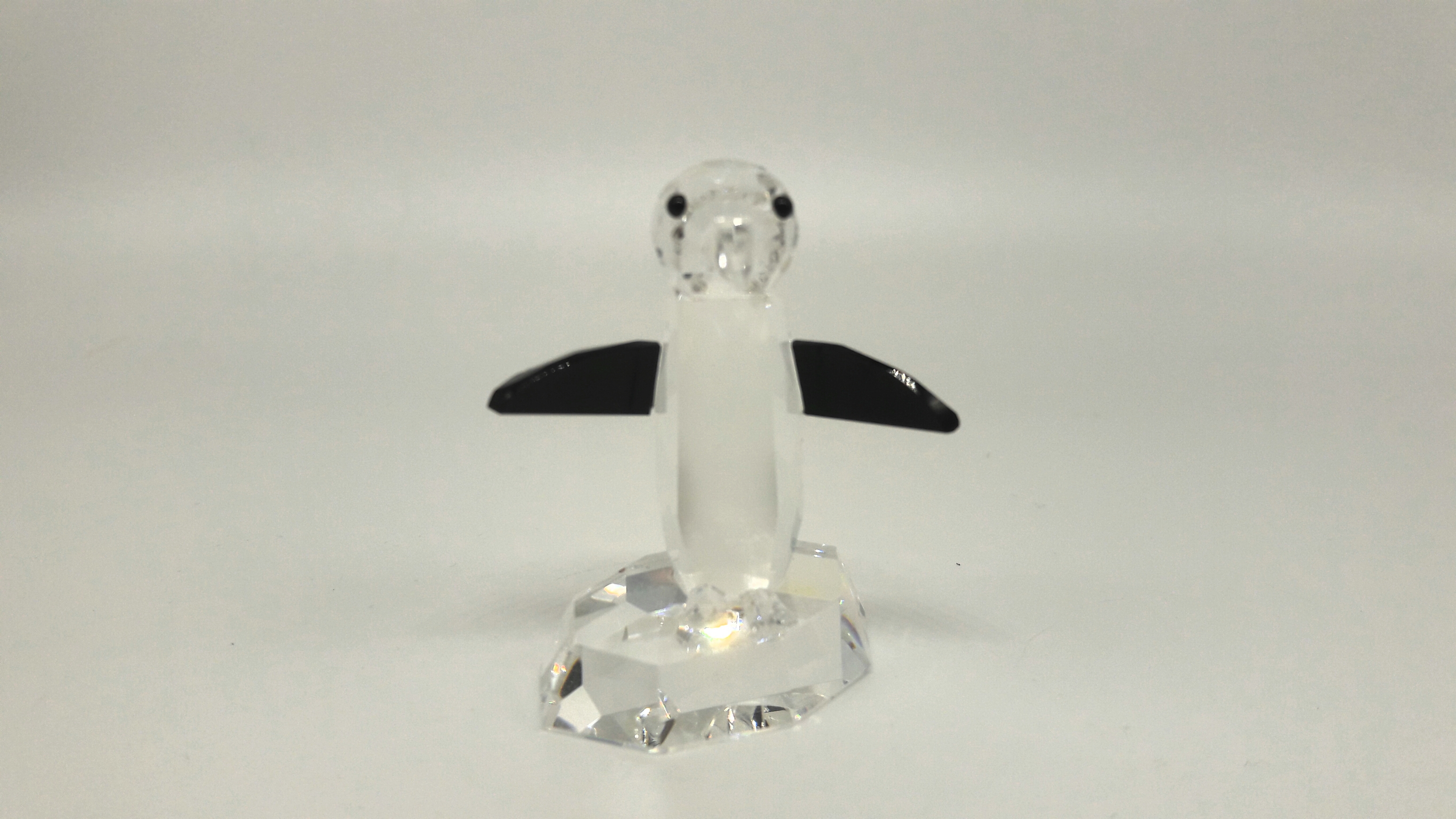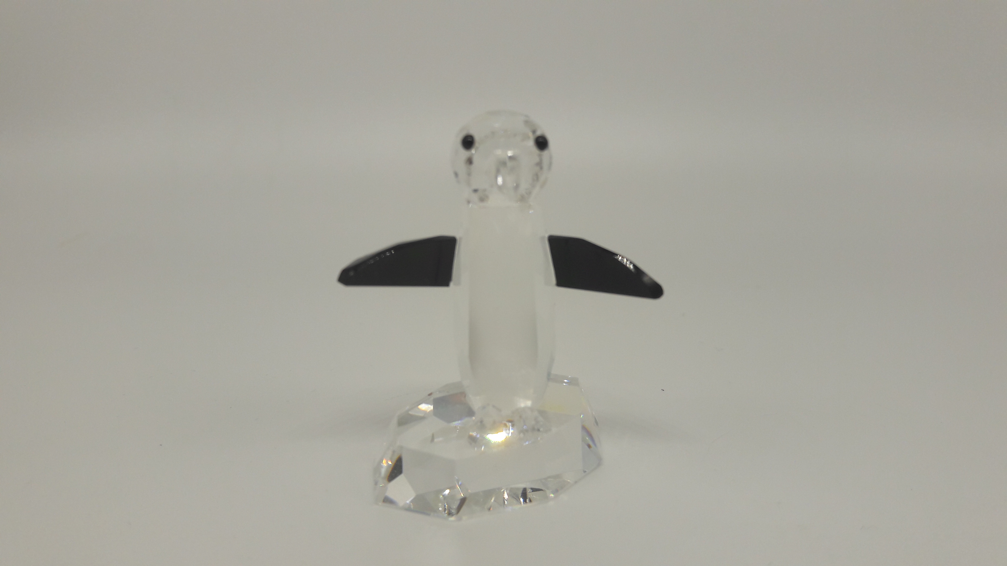 • Crystal penguin ornament with black outspread arms, rounded beak and black eyes. The base is tilted towards the front at a small angle and welded to the main animal body piece