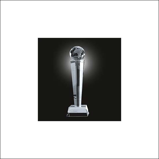 Made of crystal, this trophy flaunts an elegant touch. On the top is a clear globe supported by a faceted pillar underneath. A stacked quadrilateral stand is further designed at the bottom for extra supporting of the whole ensemble.